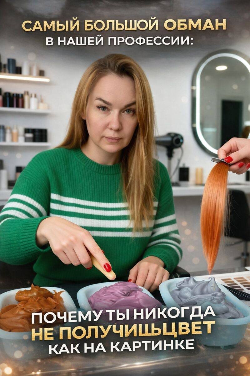 ❗️❗️❗️❗️ 😊😊😊😊😊😊😊😊😊😊😊 🎯ТЫ СТОИШЬ ПЕРЕД СТОЙКОЙ С КРАСКАМИ,ЛИСТАЕШЬ ФАРБ-КАРТУ 🎯 😊😊😊😊😊😊😊😊😊😊😊 ⚡️Показываешь клиенту этот идеальный, сияющий хвостик 8.34 и уверенно говоришь: «Будет вот такой теплый медный блонд!». Ты смешиваешь, красишь, смываешь... и получаешь грязно оранжевую массу. ⚡️Клиент смотрит на тебя с немым вопросом. Ты винишь воду, гормоны клиента, партию краски — кого угодно, только не себя. Пора признать горькую правду: твоя фарб-карта — это красивая ложь. ⚡️Я проверяла сотни красителей. 40-50% из них вообще не соответствуют цвету на карте! Я видела «зеленый» микстон, который давал синий оттенок. «Оранжевый», который был просто желтым. Эти идеальные хвостики в твоей палитре чаще всего окрашены текстильными пигментами, а не твоей краской! Производители просто берут готовые выкрасы, которые «похоже выглядят». ⚡️Запомни навсегда: То, что в твоем тюбике, и то, что на картинке — это РАЗНЫЕ ВЕЩИ. Фарб-карта — это просто этикетка для удобства, а не обещани