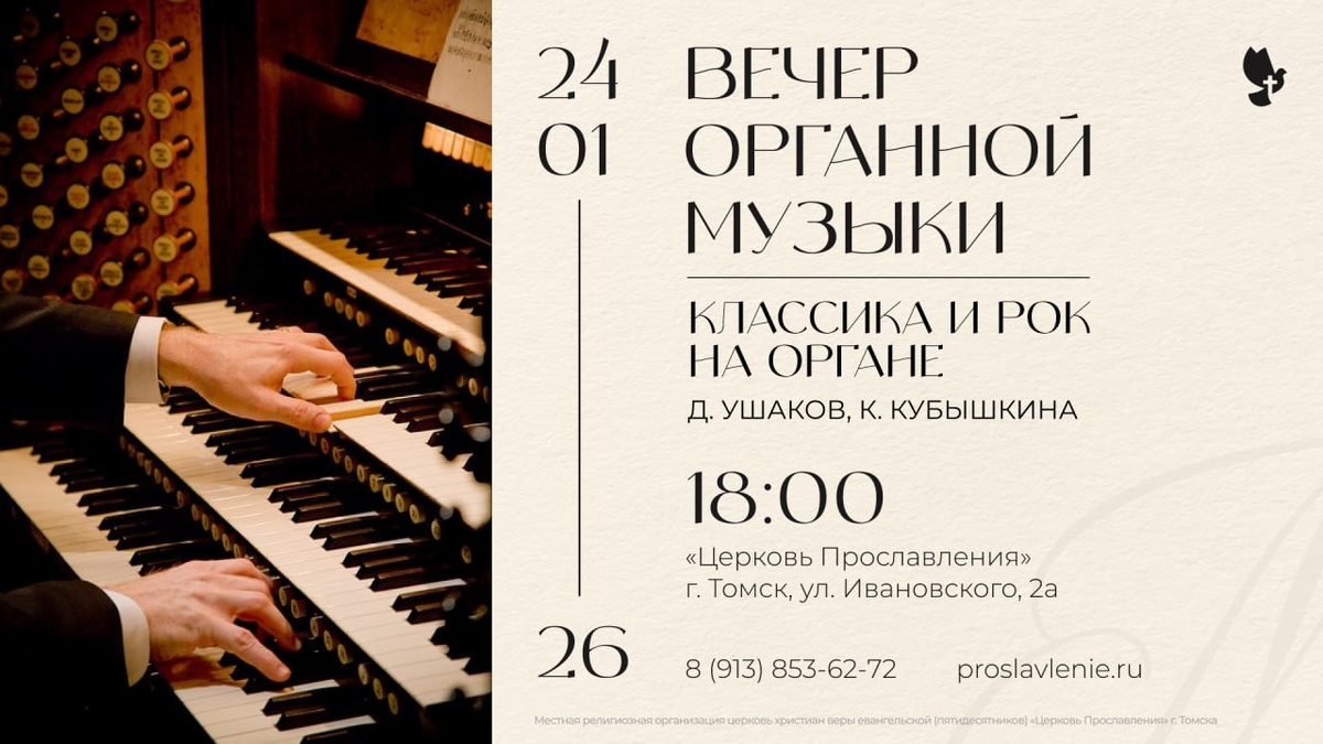 🔸 🎹 24 января в 18:00 пройдет вечер органной музыки! В программе — сочинения разных эпох: от произведений Баха, Букстехуде и Генделя до обработок известных композиций групп The Beatles, Pink Floyd, Rolling Stones. На органе играют: • Дмитрий УШАКОВ • Капитолина КУБЫШКИНА Это уникальная возможность услышать, как мощный и многогранный орган интерпретирует музыку, написанную в совершенно разных стилях. 📍Место: «Церковь Прославления», г. Томск, ул. Ивановского, 2а 👨👩👧👦 Вход свободный!