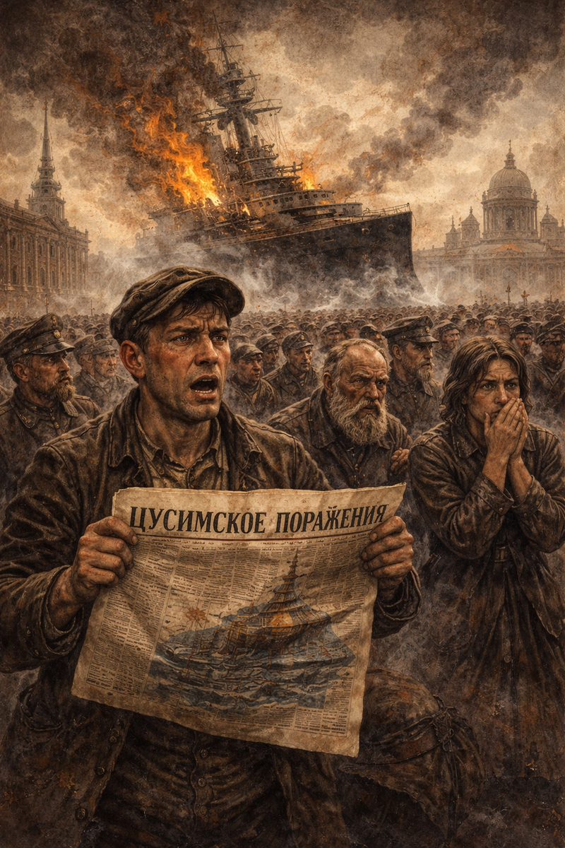 А последствия — десятилетиями. Когда в Петербург пришла весть, сначала было молчание. Потом — недоверие. Потом — злость. И наконец то самое чувство, от которого государства не оправляются: стыд. Люди ещё выходили на работу. Поезда ещё ходили. Газеты ещё печатались. Но внутри что-то сломалось. Не у рабочих — у всех. Если флот можно уничтожить так легко