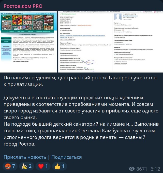 📊 Ростовский телеграм-канал Ростов.ком с аудиторией почти 20 тысяч подписчиков сообщил: в Таганроге готовится к приватизации второй рынок