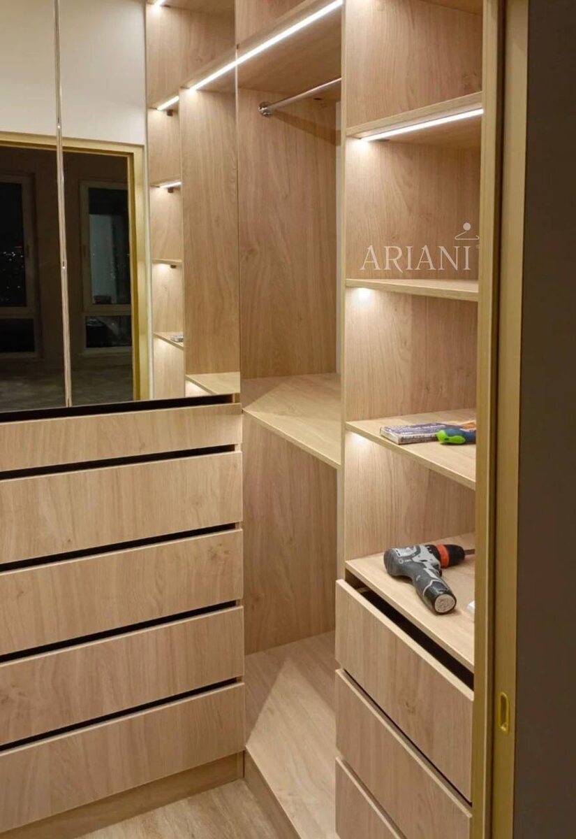 Это гардеробная для того же клиента, чей проект мы показывали вчера — светлая, аккуратная и максимально продуманная для повседневного комфорта. Решение сочетает чистые линии и продуманную эргономику, чтобы вещи были под рукой, а пространство — визуально свободным. • выполнена из светлой древесины — экономит место и делает доступ к вещам удобным. • Интегрированная LED‑подсветка под полками — аккуратно подчёркивает полки. • Сочетание открытых полок, штанг для вешалок и широких выдвижных ящиков без ручек — удобство хранения. • Зеркальные фасады — визуально увеличивают пространство и удобны при примерке. 🖤Если хотите проект под ваш интерьер —пришлите фото или план, подготовим вариант под ваши задачи. ➖➖➖➖➖➖ Обратитесь к нам уже сегодня, и мы поможем воплотить вашу мечту в реальность 📱+74993224342 ✈️написать в чат менеджеру