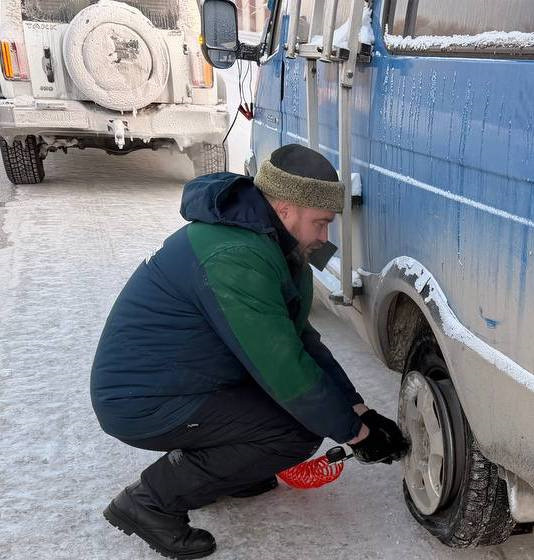Летом любой маршрут — отдых. Ну, даже, допустим, сломался, ну вылез, лёг, загораешь… Когда на улице не до загара, совсем по другому себя чувствуешь. Сегодня у нас похолодало (только что-то про погоду писал же), ещё вчера было всего 35, сегодня с утра уже до 40 опустилось, как пишут синоптики на сайте: "ощущается как -52". Я не планировал бы загорать в такую погоду, а маму с самолёта встретить было надо, поэтому с утра включил электроподогрев, попил чаю и поехал. Казалось бы — что может пойти не так? До трассы тут километра 2, а там хоп, и аэропорт уже… Пока с горочки по грунтовке спускался трясло, конечно, но всё же застывшее, не придал значения. Выехав на асфальт всё-таки показалось — "что-то не то". Оказалось, что не показалось, всё именно то, чего не хотелось бы. Заднее левое колесо слетело с диска. Тут на фото уже и компрессор видно и машина на домкрате, но запись эта того не стоила бы, если бы это всё у меня сразу было. И я думал, что оно у меня таки есть. Когда покупал машину мне