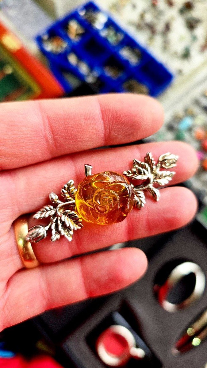 Серебро янтарь брошь