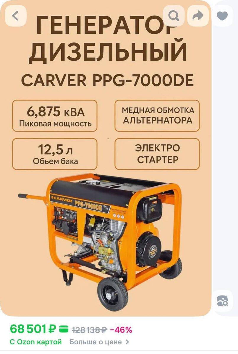 дизельный 6 кВт, - 68 501 https://ozon.ru/t/A0WU9P8 Осталось собрать 30 909 🔥 По Кофейку ?? 100 чашек кофе по 309р и сбор закрыт . Ну а если кофе с краусаном … то еще вкуснее быстрее закроем 🙏🏻 Реквизиты для перевода: — Т‑Банк: 2200701225452439 — СБП: 89936125765