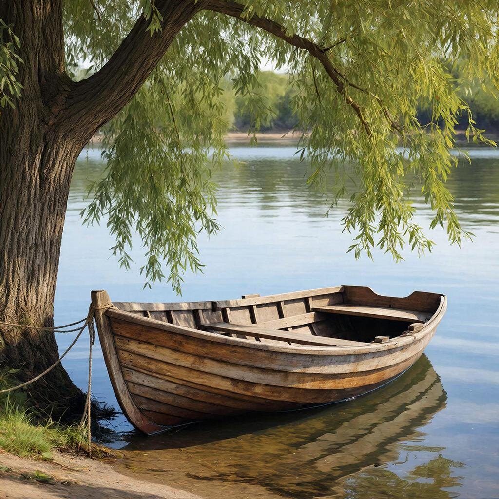 У самого берега, привязанная к могучему стволу старой ивы, покачивалась небольшая лодка. Её деревянные борта, выцветшие от солнца и времени, казались частью этого умиротворенного пейзажа. Лодка была пуста, но её присутствие добавляло картине нотку ожидания, словно она ждала своего хозяина, чтобы отправиться в вечернее плавание.
