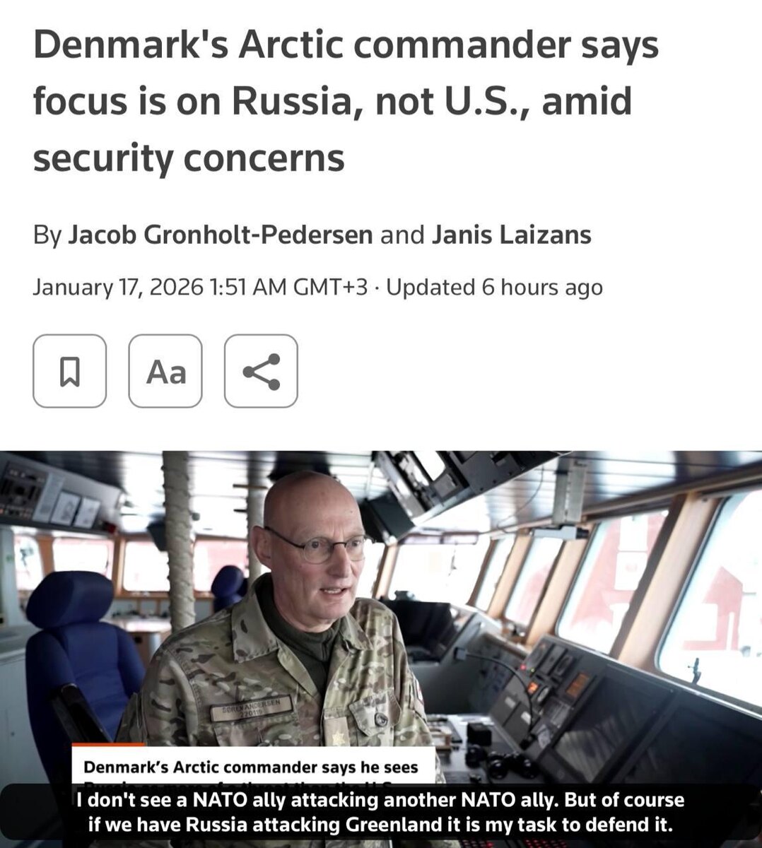 Моё внимание сосредоточено на России». Об этом заявил Reuters командующий Арктическими силами Дании. Но уточнил: вблизи Гренландии нет ни российских, ни китайских кораблей. Трамп ранее сказал, что Вашингтон так или иначе заберёт остров, и назвал нежелание его жителей стать частью Штатов «их проблемой». 🌐 За Русский Мир©Резервный📣Наш Чат✔️Подпишись‼️