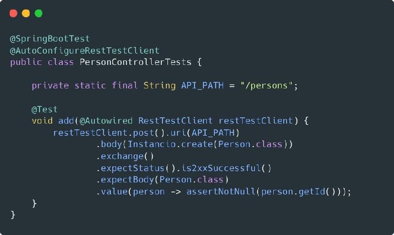 ` 🚀 В Spring Boot можно легко писать интеграционные тесты для REST-эндпоинтов, используя `RestTestClient` вместе с аннотацией: @AutoConfigureRestTestClient Это автоматически настраивает клиент и позволяет: - отправлять запросы прямо из тестов - проверять статус и тело ответа - работать с объектами, а не “сырым” JSON Пример Копировать код @SpringBootTest @AutoConfigureRestTestClient public class PersonControllerTests { private static final String API_PATH = "/persons"; @Test void add(@Autowired RestTestClient restTestClient) { restTestClient.post().uri(API_PATH) .body(Instancio.create(Person.class)) .exchange() .expectStatus().is2xxSuccessful() .expectBody(Person.class) .value(person -> assertNotNull(person.getId())); } } 👉 Для TestRestTemplate есть похожая аннотация: @AutoConfigureTestRestTemplate Тесты становятся чище, короче и ближе к реальному поведению API ✨ @javarush