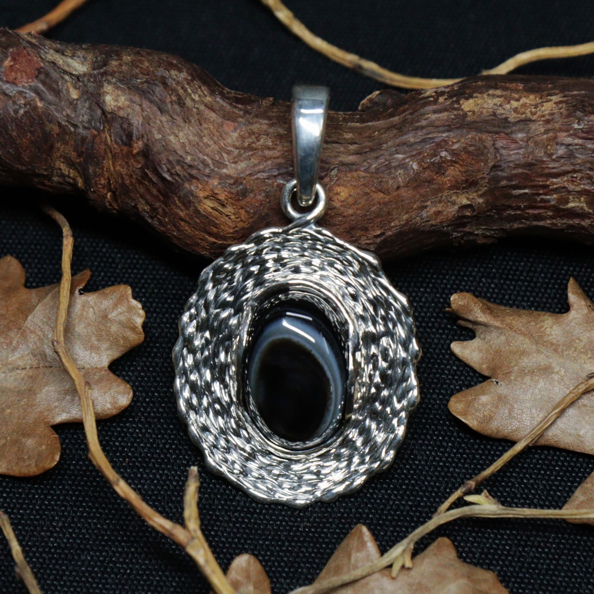 Глубокий взгляд черного глазкового агата как будто следит за всем, что происходит вокруг, не упуская малейших деталей. Вокруг него рябью волн расходится блестящий металл, создавая очертания то ли символического замысловатого цветка, то ли неизведанной космической черной дыры. Возможно, это зависит от того, с чьим взглядом встретиться пронзительный взгляд этого агата. Осмелитесь ли вы посмотреть в Бездну и познать ее мудрые тайны? Этот кулон про спокойную уверенность, основанную на опыте и знаниях. Абсолютную защиту от любого зла, которое даже не осмелится показаться на глаза. Веру в себя, в свои цели, идеалы, выбранный путь. Про бесконечное стремление к знаниям и разгадкам самых невообразимых тайн нашего мира. Черный агат считается достаточно сильным защитным камнем. Он приносит благополучие и достаток, помогает принимать мудрые и взвешенные решения, повышает интеллектуальную активность. Агат с природным рисунком, напоминающим глаз, отражает негатив своим внимательным взглядом, оберега