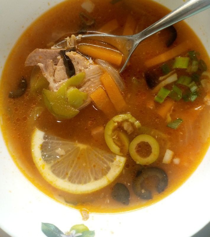 Всем моё приветствие! По вашим просьбам, девочки, а так же мальчики, пишу вам про то, как готовлю мясную солянку. Солянка это блюдо легендарное, исконно русское, знакомое каждому россиянину с детства. 😄😄 Ну или почти каждому россиянину. Её любят за насыщенный вкус, разнообразие ингредиентов и незабываемый аромат. Но среди множества видов солянок особенное место занимает мясная сборная - настоящая находка для любителей сытных и богатых блюд. Это многокомпонентное блюдо, сочетающее разные виды мяса, копченостей, колбас, овощей и специй. Готовится она основательно, поскольку требует подготовки каждого ингредиента. Солянка объединяет всё лучшее, что русская кухня способна предложить: мясо, рыбу, грибы, овощи и специи превращаются в единое целое, создавая настоящий кулинарный шедевр. Про рыбную солянку я уже писала здесь: Основные ингредиенты сборной солянки: - Несколько сортов мяса и колбасы: говядина, свинина, ветчина, сосиски, охотничьи колбаски. - Оригинальный кисло-сладкий вкус при