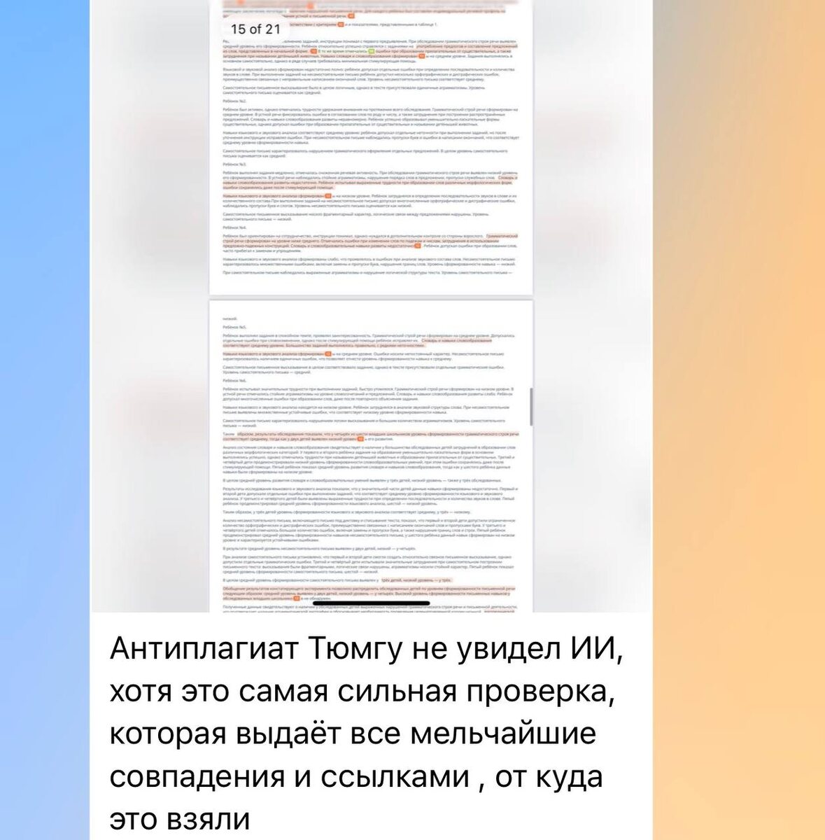 Сегодня у нас случился очень показательный кейс: ❗️Антиплагиат Тюменского государственного университета проверил работу — и не увидел в ней искусственный интеллект. важный момент: это было не Ctrl+C / Ctrl+V из сервиса ИИ, не “накидал абзацы из интернета” и не шаблонная генерация. ➡️Это был обученный под задачу ИИ, который: • структурировал материал, • писал связный академический текст, • держал логику, • не копировал чужие фрагменты, ❗️и в итоге сэкономил студенту огромное количество времени. Информация, которую студент взял из книг вручную, при проверке не прошла антиплагиат. То есть фрагменты, собранные из реальных источников, система посчитала неуникальными. А текст, который сделал ИИ — прошёл. Почему так происходит? Потому что антиплагиат ищет совпадения, а качественная ИИ-работа может быть: • уникальной по формулировкам, • логичной по структуре, • без прямых заимствований. Итог простой: 🔥ИИ — это реально инструмент, который помогает в любой деятельности, главное, использо