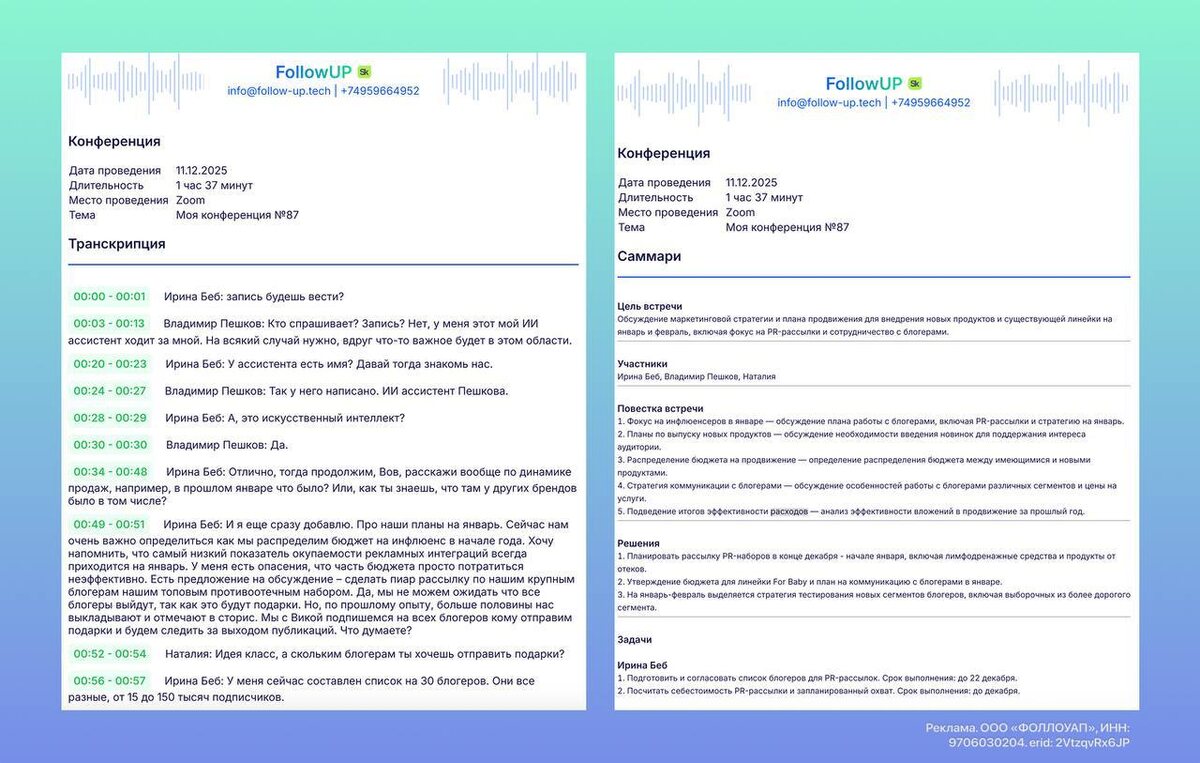 Было не просто вливаться в работу после всех событий, но пришлось. На неделе уже успела провести 2 рабочих созвона и еще раз убедилась насколько сильно мне экономит время и силы нейросеть followUp Уже рассказывала про нее, но на помню еще раз для новеньких: Сервис подключается к календарю (Google / Яндекс), сам приходит на встречи и после каждого созвона присылает: — текстовую расшифровку по спикерам — саммари встречи — все решения, договорённости и задачи Ничего запускать вручную не нужно: назначили встречу — ИИ ассистент уже там. Полезно для руководителей и IT: — прозрачность и контроль встреч команды — архив всех созвонов с быстрым поиском — сервера и хранение данных в РФ — интеграция с B24, AMO Для бизнеса: Подключите команду на тест — FollowUp даст доступ всем сотрудникам на 10 дней и проведёт бесплатный онбординг. Для личного использования: Безлимитный доступ на 7 дней.