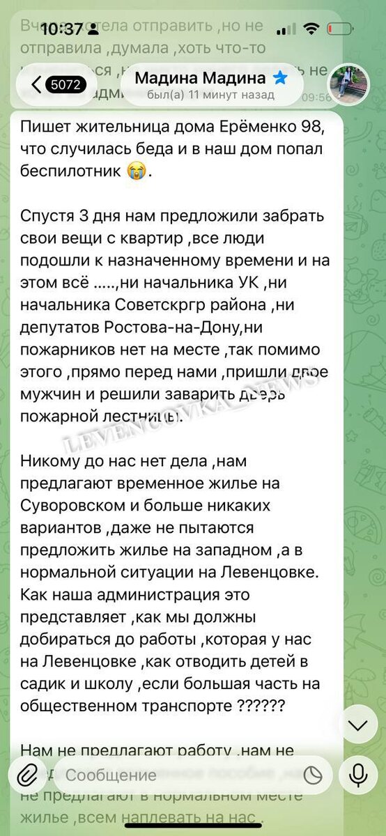 Жители пострадавшего от БПЛА дома на Левенцовке жалуются в районных каналах, что уже три дня не могут попасть внутрь, чтобы забрать вещи. Среди людей активно распространяются слухи, что дом собираются признать аварийным и расселить — этому сильно способствует молчание от чиновников. Территория у дома огорожена, вчера оттуда эвакуировали все автомобили, а сегодня в пострадавшем подъезде заварили вход на пожарную лестницу. Люди очень не хотят переезжать в маневренный фонд на Суворовский и, судя по комментариям, настроены воинственно (а что им остаётся). Знакомые вайбы, да? Уважаемым городским управленцам хорошо бы публично выступить и прояснить ситуацию, пока опять не дошло до громкого скандала. Напомним: основная претензия жителей — что нет точной информации, что ждёт их самих и их имущество. Успокойте людей, пожалуйста.