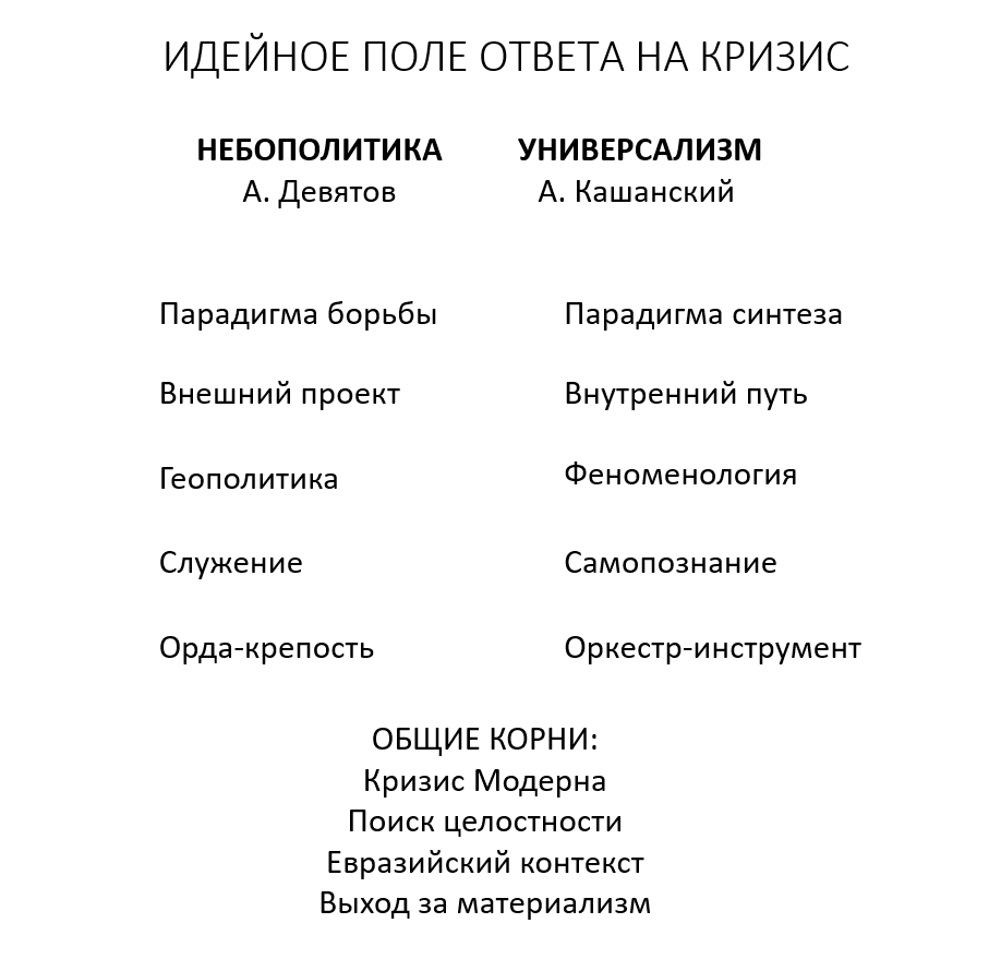 - Выход за рамки материализма: у Девятова — через «небесный мандат» и этику благочестия, в универсализме — через «Мир идей» и Замысел.
