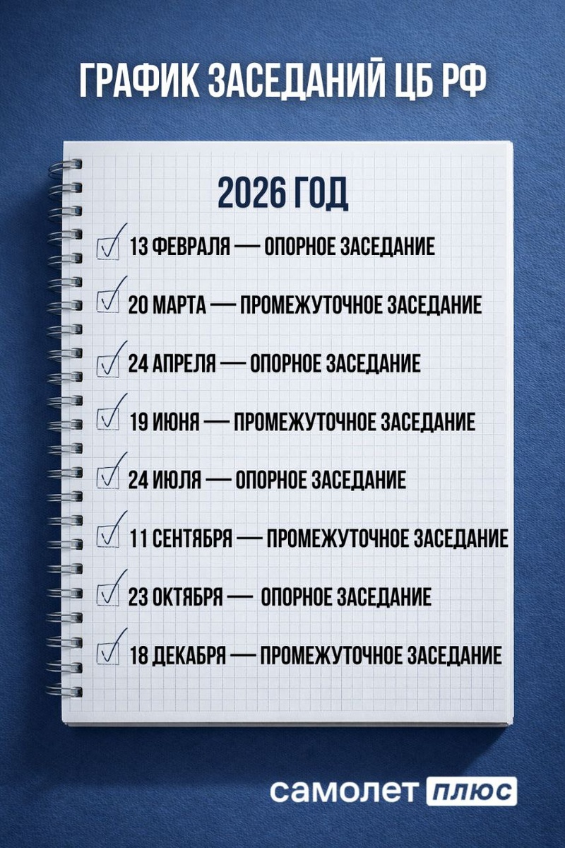 ✈️Делимся утверждённым графиком заседаний Банка России. Первое заседание в 2026 году состоится 13 февраля. 📌Сохраните, чтобы не потерять важные даты и быть в курсе возможных изменений. #самолетплюс #ЦБРФ #сделка22 #центробанк #ключеваяставка #финансы #экономика #недвижимость #ипотека