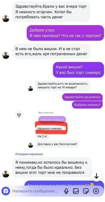 Не моё. Наткнулась в сети, показалось забавным). Каких только альтернативно одарённых не бывает." ❓ Сталкивались с подобным отношением со стороны заказчиков? ❓ Как реагировали? ❓ А в вашем "Сникерсе" есть вишня? Если у вас есть интересная история из жизни домашнего кондитера, вопрос к нашей аудитории, рецепт/совет, которыми вы хотите поделиться, отправляйте материал на адрес pirogeevo@yandex.ru