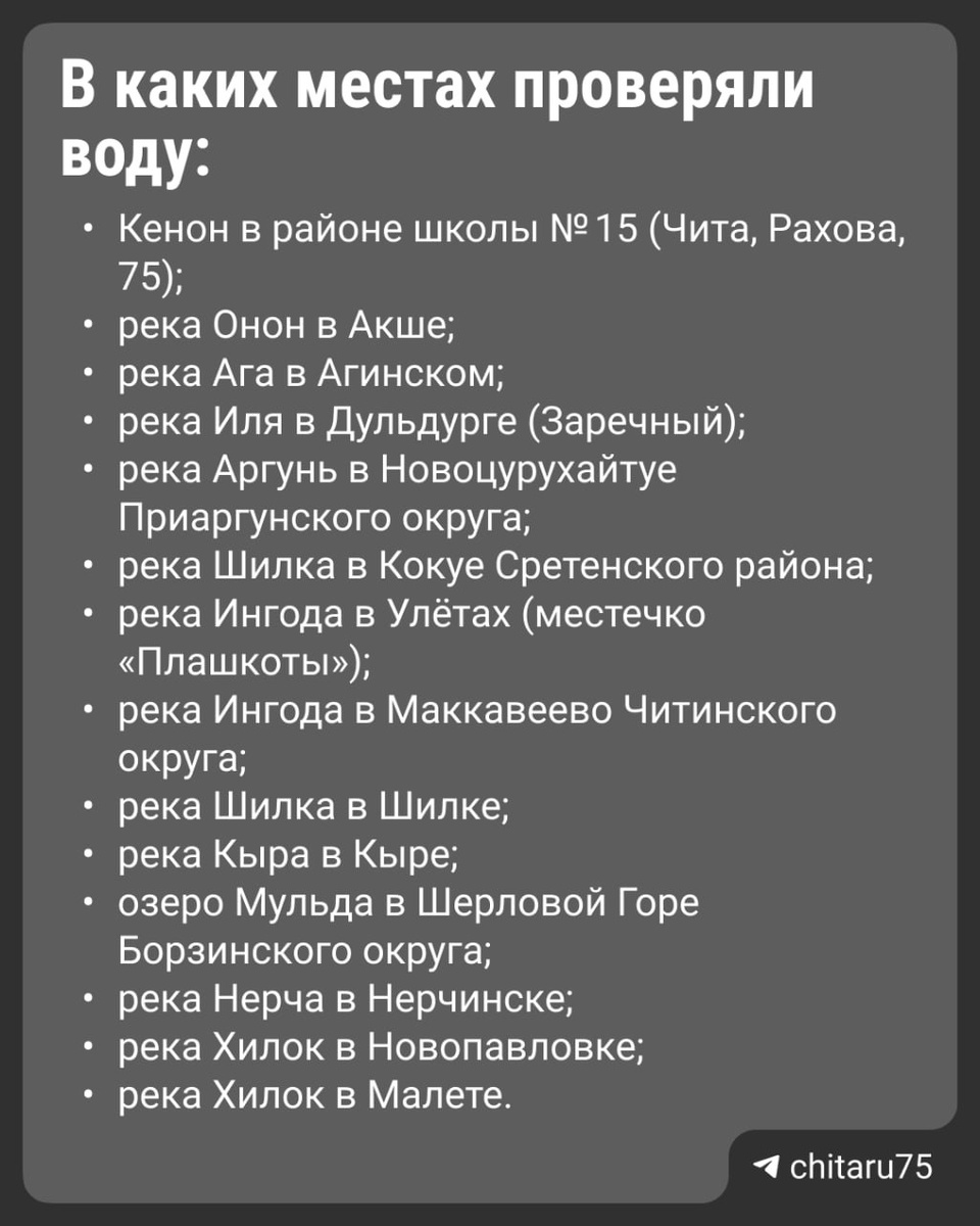 В тг-канале краевого управления Роспотребнадзора пишут, что на реке провели анализы: колониеобразующих единиц кишечной палочки оказалось 864,9 единиц на 100 мл при норме не больше 100 единиц. 💬Колониеобразующая единица — это количество микробов в образце, которые могут жить или делиться в контролируемых условиях. Глава округа Виктор Машуков пояснил @chita.ru, что власти оповестят людей, но запрет вводить не станут. Роспотребнадзор рекомендует отменить купания на Ингоде в Маккавеево. Всего центр гигиены и эпидемиологии в Забайкалье 14 и 15 января взял пробы воды в 14 местах.⬆️ 📌📌 Предложить новость