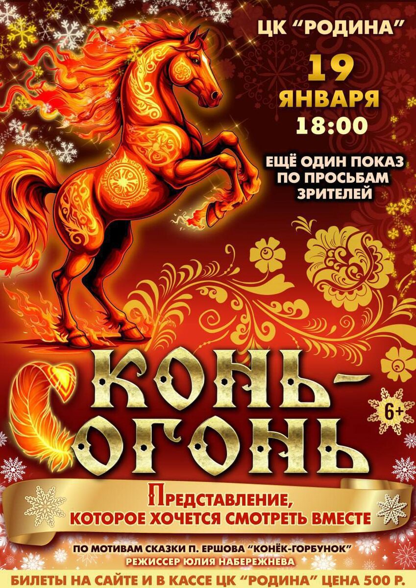 » 4️⃣ЕЩЁ ОДИН ПОКАЗ ПО ПРОСЬБАМ ЗРИТЕЛЕЙ Сказочное представление по мотивам любимой сказки Петра Ершова в режиссёрском прочтении Юлии Набережневой, в исполнении артистов студии мюзикла «Метаморфозы» и театра-студии «Образ» - ещё один раз на большой сцене Центра культуры «Родина». 🔥🔥🔥 Не успели увидеть, как зажигал «Конь-огонь» Спешите к нам 19 января! ⠀⠀ 📆 Дата: 19.01 ⏰ Время: 18:00 📍 Место: ЦК РОДИНА