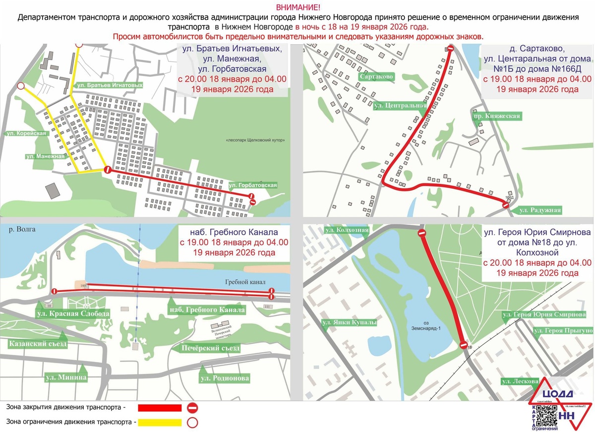 Так с 19.00 18 января проезд будет закрыт на Гребном канале, а также в деревне Сартакове - на улице Центральной между домами №1Б и №166Д. Машины смогут вернуться сюда только после четырех утра 19 января. С 20.00 к списку ограничений добавятся еще несколько точек: перекроют движение в районе улицы Героя Смирнова от дома №18 до улицы Колхозной. Аналогичные меры коснутся улиц Братьев Игнатовых, Манежной и Горбатовской. 📸 городская администрация