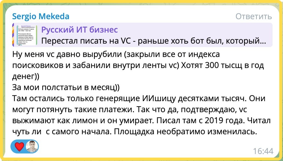 Раньше каждое утро заходил на VC - читал новости и т.п. Писал комменты. А сейчас - даже мысли нет. Неуловимо что-то поменялось, и отличное отраслевое СМИ стухло :( Русский ИТ бизнес