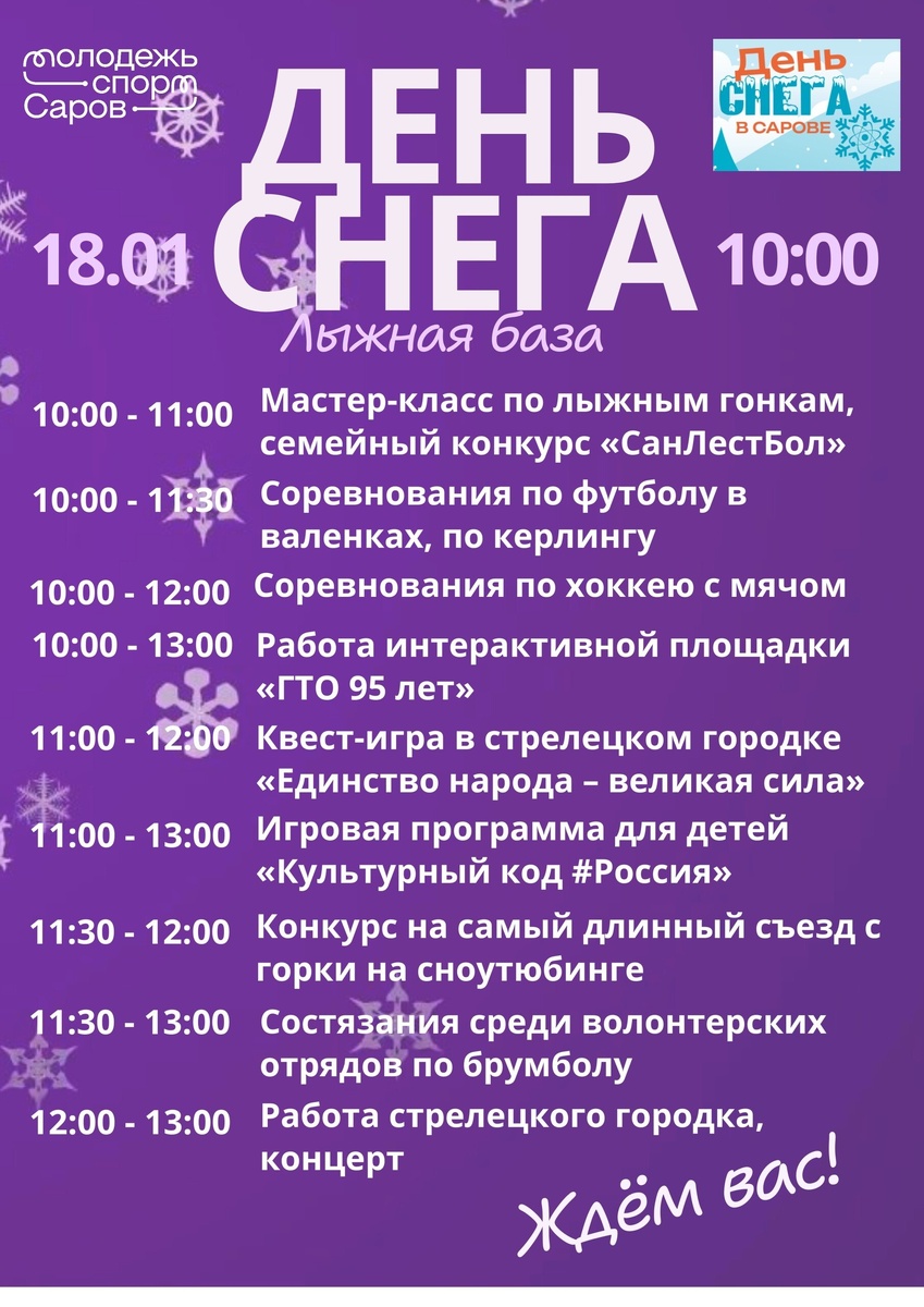 С 10:00 на Лыжной базе горожан ждут спортивные соревнования, семейные эстафеты и конкурсы, квесты, игровые программы, стрелецкий городок и выступления творческих коллективов города. В 13:00 эстафету праздника передадут на хоккейную коробку "Сокол". Там пройдут городские соревнования по хоккею среди дворовых команд "Золотая шайба". Также в этот день будут организованы сеансы массового катания на стадионе "Икар" и в Ледовом Дворце. ☃ Ждём вас в воскресенье на зимнем празднике города!
