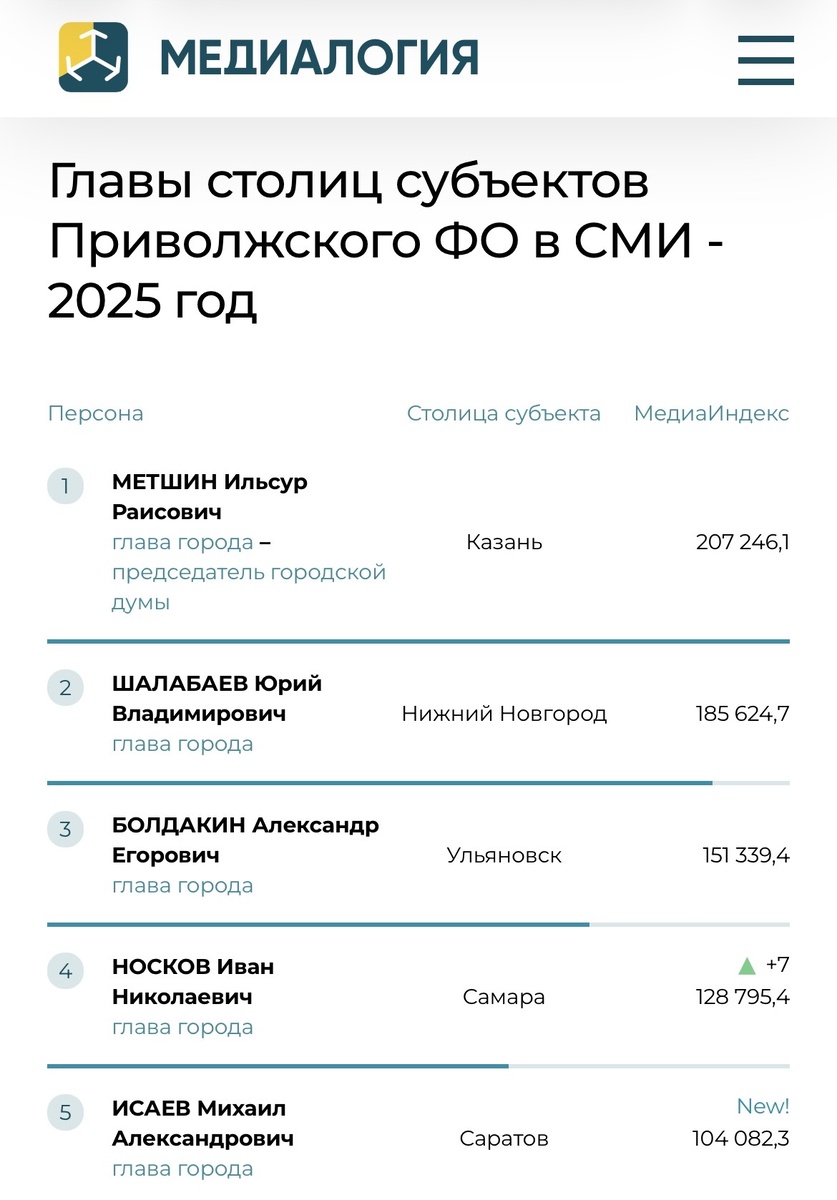 Мэр Самары Иван Носков укрепил свои позиции в рейтинг первых лиц столиц ПФО. Рейтинг построен по российским СМИ на основе базы СМИ системы «Медиалогия», включающей более 108 тыс. источников: ТВ, радио, газеты, журналы, информационные агентства, Интернет-СМИ. По итогам 2025 года Иван Носков находится на четвёртом месте. Его медиаиндекс, учитывающий число ссылок в СМИ, их качество и влиятельность цитирующих ресурсов, составляет 128 795 пунктов. При этом глава Самары показал одно из самых заметных перемещений в рейтинге первых лиц – сразу на 7 пунктов вверх. Скрин - сайт «Медиалогия» Первую строчку рейтинга самых цитируемых мэров ПФО занимает глава Казани – председатель городской думы Ильсур Метшин (207 246 пунктов), а на последней 28-ой строчке – новый участник рейтинга Владимир Островский, он занимает должность председателя городской думы Саратова (29 пунктов).