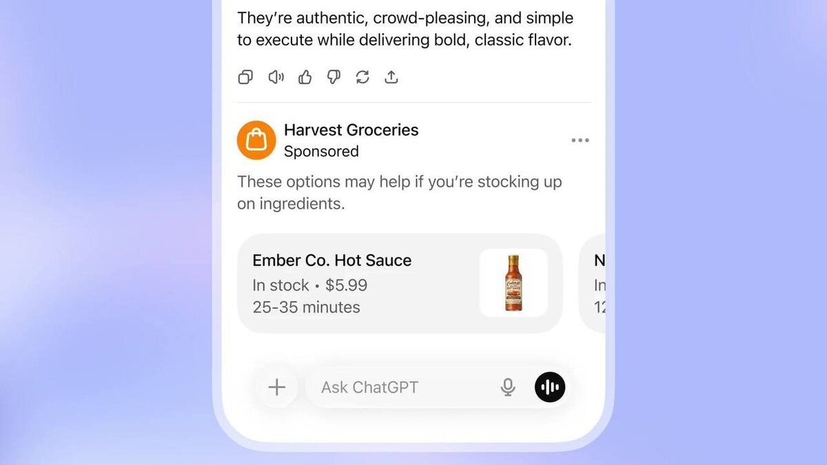 OpenAI объявила о внедрении рекламы в ChatGPT. Как она будет выглядеть показано на фото. Первые недели будет тестироваться в США, реклама будет показываться исходя из контекста общения. В OpenAI подчёркивают, что реклама не будет влиять на объективность ответов ИИ. Вместе с этим компания приняла решение расширить доступ к подписке Go. Она стоит 8$ в месяц, что на 12$ дешевле, чем Plus. Пользователи получают расширенные лимиты на сообщения, генерацию изображений, загрузку файлов и доступ к функции «память». Реклама будет видна пользователям тарифа Go и также бесплатным пользователям. В остальных платных тарифах её не будет. ⚡️ Подписаться.