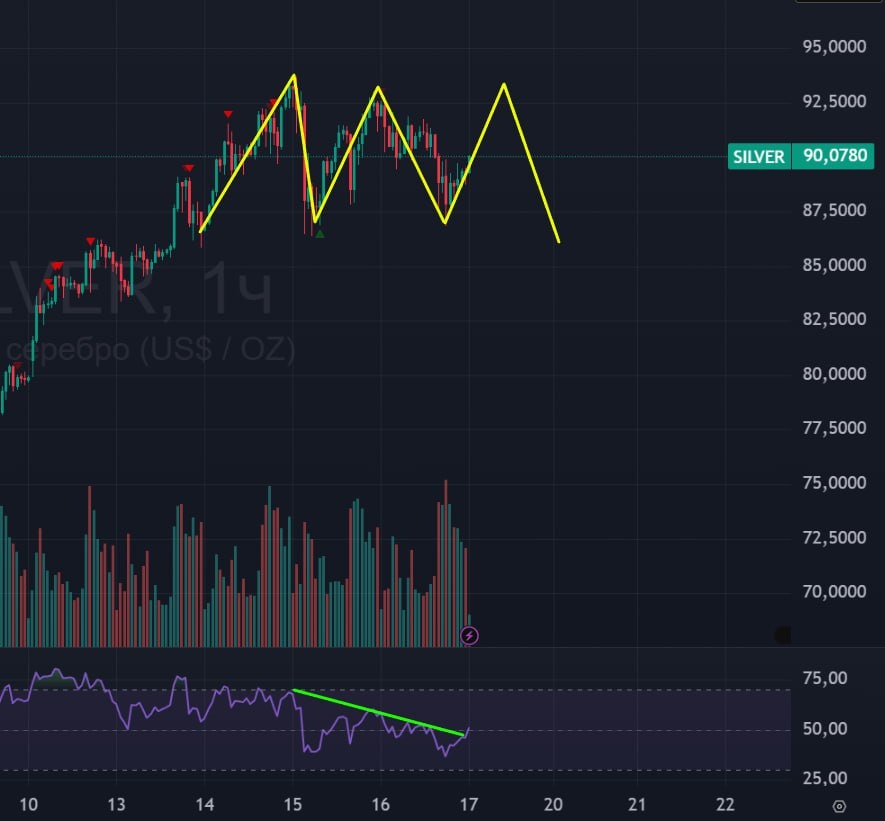 🟢Локальная картинка: часовой тайм-фрейм. Основное падение в серебре началось 15-го января после того как Трамп сказал, что в Иране закончились казни протестующих. Человеку, вне мира трейдинга, эти события никак не показались бы связанными. Однако, у нас тут своя атмосфера. Спекулянты теперь борются за рост и за падение серебра. 🟢Предполагаю, что рост продолжится в ближайшие дни до хая, после чего поедем вниз, нарисовав тройную вершину. За локальный рост у нас RSI, которая сломала зеленую наклонку, закрывшись над ней. 🟢 За падение металлов после тройной вершины у нас рост 10-леток. 🚗 Так что жду в серебре тройной вершины, после чего снова снижение. Падение серебра жду до наклонки, о которой писал в прошлом посте про серебро. #серебро #silv #silver #svh6 #bogdanoffinvest $svh6 $svm6