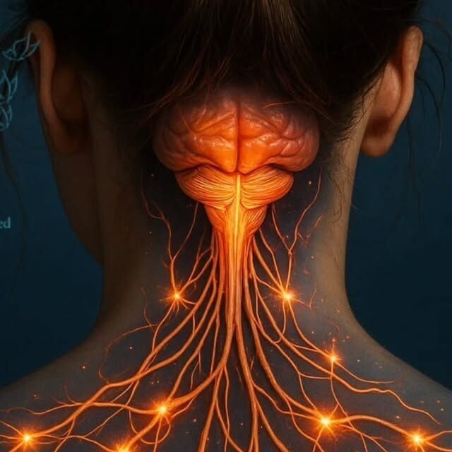 напряжённая шея, плечи, спина → нарушенное дыхание и кровообращение → ощущение тяжести в голове, усталость,