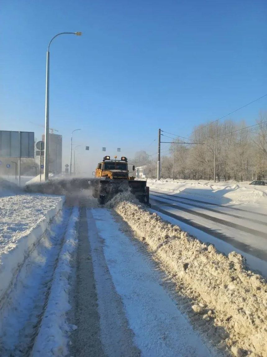 Техника занята сразу на нескольких участках улицы. С помощью шнекоротора перекидывают снег. Дорожные рабочие расчищают остановочные площадки. Фото: Кемдор ❤️ Наш канал в Дзен