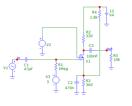 Продолжаем изучать моделирование на микрокапе. Данная схема - несколько видоизмененная схема АРУ, которая ест в расширенном даташите на транзистор. Там приведены 2 схемы - на 200 МГц и 800 МГц с входным и выходным сопротивлением 50 Ом. V1 - входной сигнал. V2 - напряжение АРУ. V3 + 5 В - напряжение на первом затворе. В практической конструкции надо предусмотреть резистивный делитель.