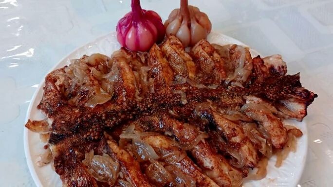 Всем приветик мои хорошие ! Хочу сегодня приготовить рыбку Судака. Получается очень вкусно , гарнир любой хоть картофельное пюре хоть овощи. Что нам понадобится : 1 рыбка любая у меня судак. 3 головки лука Масло растительное для обжарки лука. Заправка : 4 ст л соевого соуса 2ч л горчицы в зернах Черный перец по вкусу 0.5 ч л приправа к рыбе 1 ч л сухой чеснок 2 ст л лимонный сок 0.5 ч л меда паприка по желанию Если рыба суховатая то добавьте сверху на рыбку кусочки сливочного масла. Запекаем 180 гр 25 минут Рыбку разрезаем вдоль хребта но не до конца . Убираем хребет , нож ведем прям по кости . Голову и хребты убираем на уху. Можно рыбку оставить как есть . Но мне нравится разрезать ее по бокам как на фото . И каждую нарезанную полоску немного перекрутить . Лук режем полукольцами и обжарим до золотистого цвета . Выкладываем прям в форму .я прям в противень . И немного распределить по размеру рыбки. Сверху на луковую подушку выкладываем рыбку. Смазываем хорошо заправкой можно так оста