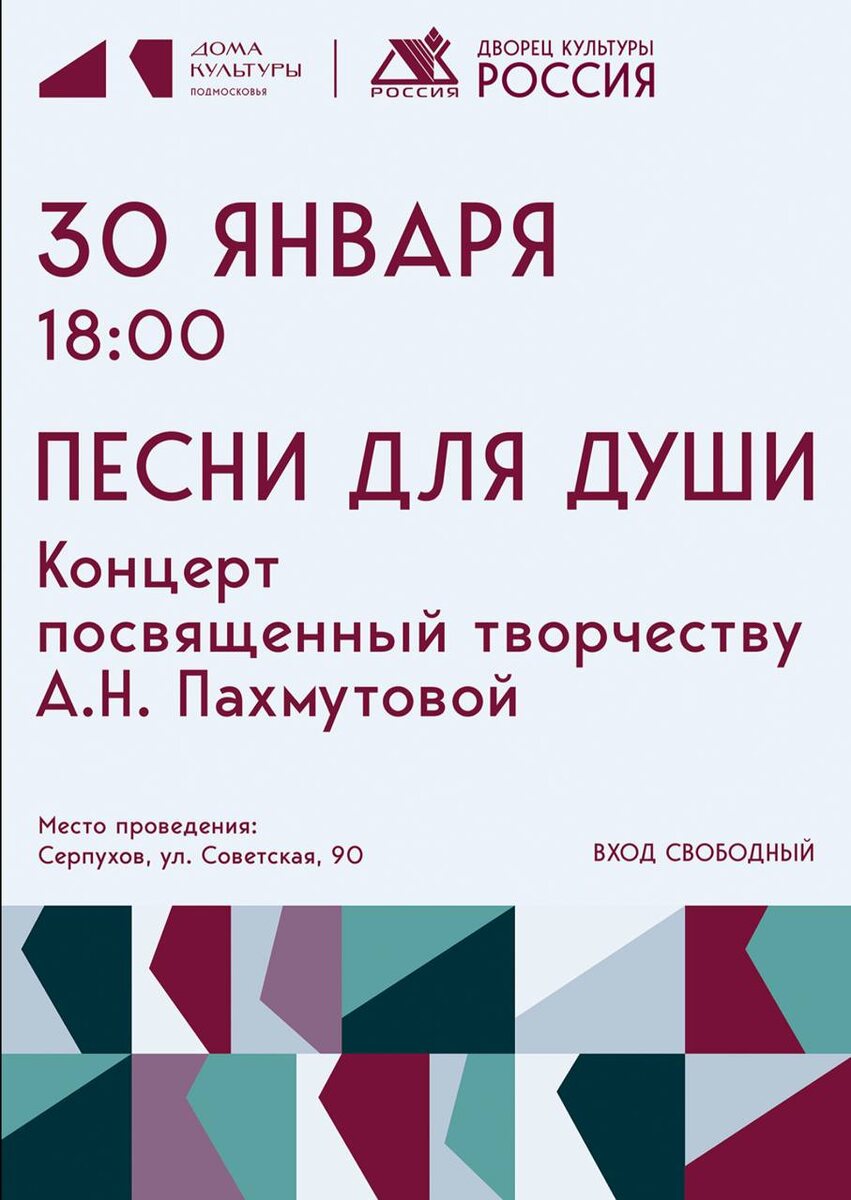✨ Концерт «Песни для души»: посвящение творчеству А. Н. Пахмутовой 🌟 🎵В программе — любимые песни легендарной Александры Николаевны Пахмутовой. На сцене: 🔹Феликс Яппаров; 🔹Ольга Дьякова; 🔹Виктория Щербакова; 🔹Оксана Завражина; 🔹Валерия Озерная; 🔹 лучшие творческие коллективы ДК «Россия». 🚫 Возраст: 0+ 📆 30.01.2026 🕒 18:00 🏢 Дворец культуры «Россия» 📍 г. Серпухов, ул. Советская, д. 90 💰 Вход свободный❗️ ⭐Поддержать канал голосом 💰 Канал Вакансии Серпухова ✅ Мероприятия Серпухов https://dzen.ru/id/66f01c6eb4c6fe60c9ca1608 http://vk.com/serpukhov_events http://dzen.ru/serpukhov_events