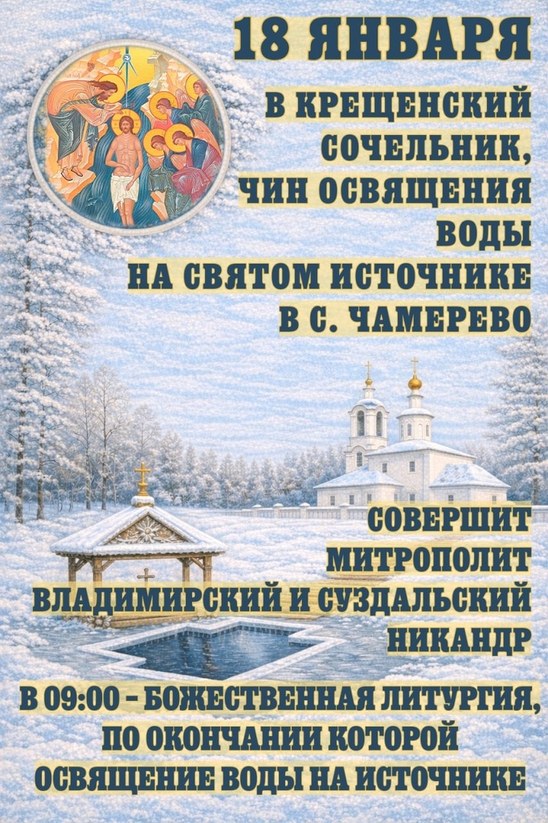 совершит богослужения: 🕯 В 9:00 – Божественная литургия в Спасо-Преображенском храме села Чамерево. По окончании богослужения митрополит Никандр совершит чин великого освящения воды на святом источнике в селе Чамерево. 🕯 В 17:00 – Всенощное бдение в Свято-Введенском Островном монастыре, г. Покров. 19 января 2026 года, в понедельник, праздник Крещения Господа Бога и Спаса нашего Иисуса Христа Владыка Никандр возглавит Божественную литургию в Успенском кафедральном соборе города Владимира. 🕯Начало богослужения – в 9:00.