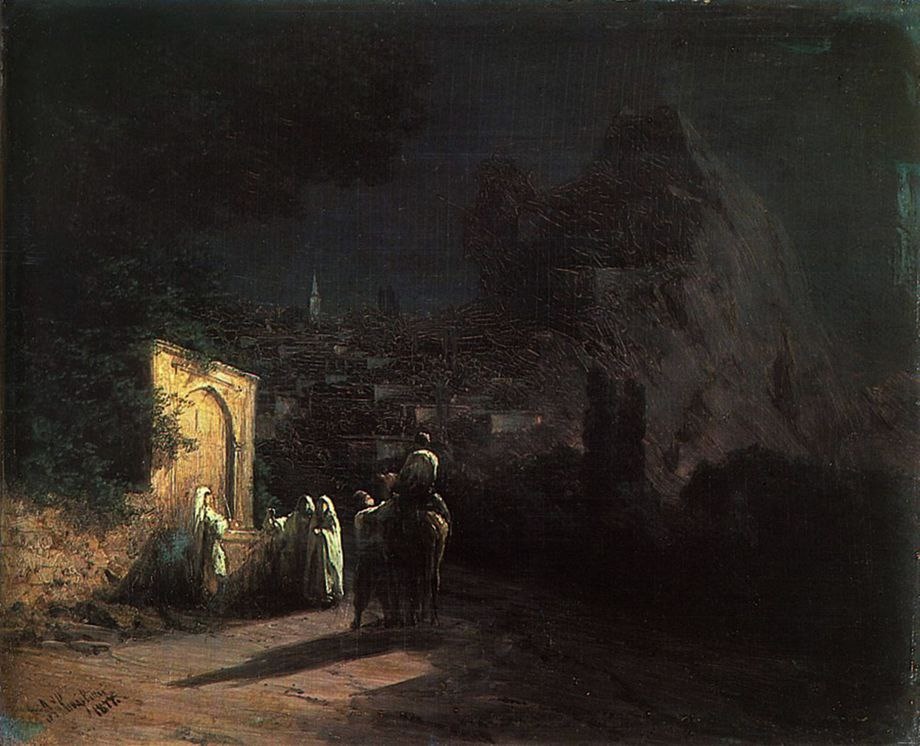 , (1817–1900). "Лунная ночь. У родника", 1877 Дерево, масло. 22 x 27 см Местонахождение неизвестно. Похищена из Национальной картинной галереи Армении в 1984 г. На данный картине мы видим фонтан Биюк-Чешме в Гурзуфе. До наших дней фонтан не сохранился. Судя по очерку Бертье-Делагарда: на фонтане была надпись, с разными благочестивыми изречениями и именами его устроителей. Оказывается, что он был сделан в 1758 году Абдул-Рахманом, сыном Эль-хадж Али-аги и Мустафой-эфенди, сыном Абдул-Рахман-заде; исправлен в 1837 году моллою Дервишем, сыном Усейн-эфенди. #живопись #искусство #графика #Айвазовский #Гурзуф