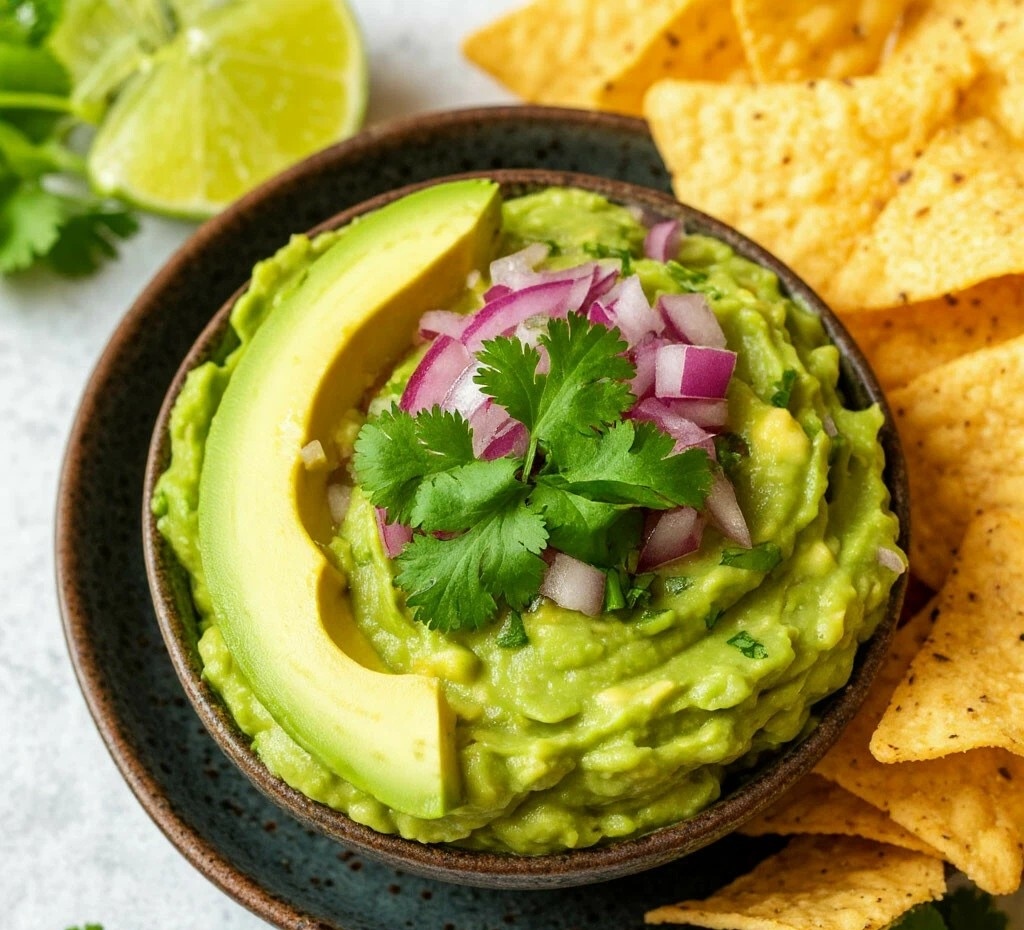 6. 🍽️ Подавайте немедленно, выложив гуакамоле в пиалу, с чипсами начос, нарезанным болгарским перцем или морковными палочками.