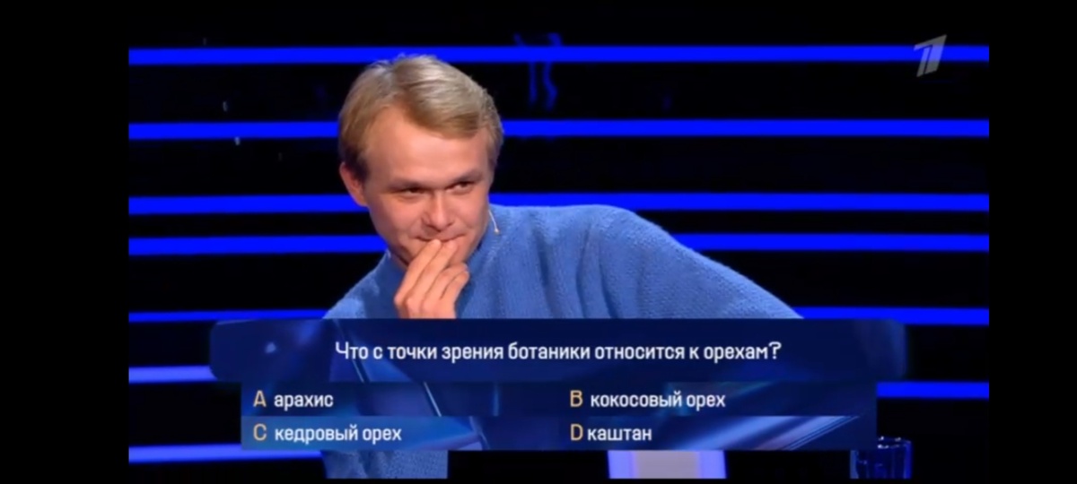 Первым на вопросы интеллектуальной игры отвечал актер Владимир Тяптушкин (роль Буратино в Малом театре). Самым сложным вопросом оказался вот такой: Что с точки зрения ботаники относится к орехам? а) арахис б) кокосоый орех ц) кедровый орех д) каштан Владимир к этому времени истратил все подсказки. Актер решил не рисковать деньгами и забрал выигрыш 200 тысяч рублей. Так какой же правильный ответ? Если бы Владимир Тяптушкин все-таки продолжил игру, то он бы остановился на варианте кокосовый орех. И это ошибка. Ведь с точки зрения ботаники кокосовый орех - это плод. А вот каштан - это орех! Первую подсказку актеры потратили на одиннадцатом вопросе: Как был обнаружен четвертый экземпляр "Черного квадрата" Казимира Малевича? а) нашли при ремонте дома б) обнаружили под слоем другой картины ц) выставили на аукцион из частной коллекции д) отдали в банк в качестве залога Александр и Владимир решили воспользоваться подсказкой 50 на 50. Компьютер оставил вариант Ц и Д. Актеры остались обескураже