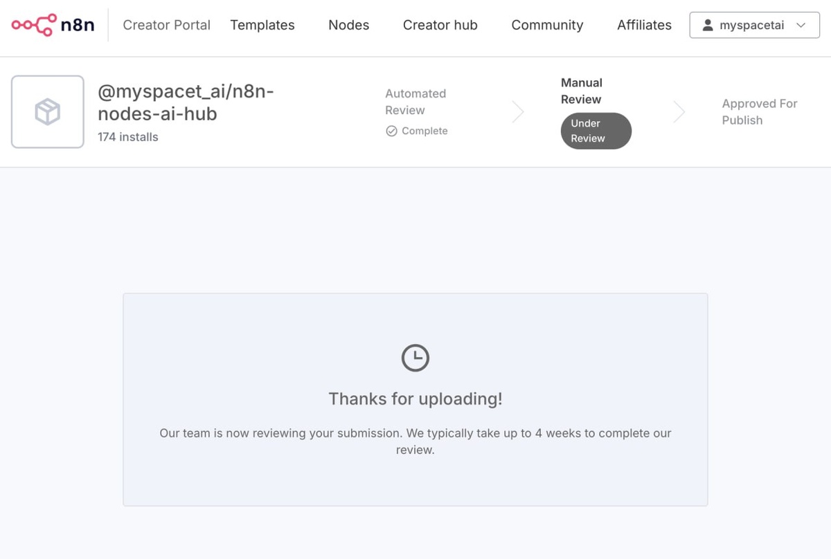 Уже прошло больше недели, как я загрузила узел @myspacet_ai/n8n-nodes-ai-hub на проверку команде n8n, но сроки пока не радуют. До момента одобрения дополнять новыми нейросетями узел нельзя, приходится напоминать о себе и ждать😄 А пока установка узла возможна только через шаблон или через раздел Кастомные ноды. Держим пальчики 🤞 @myspacet_ai #n8n #customnode #нейросети #ии #ai