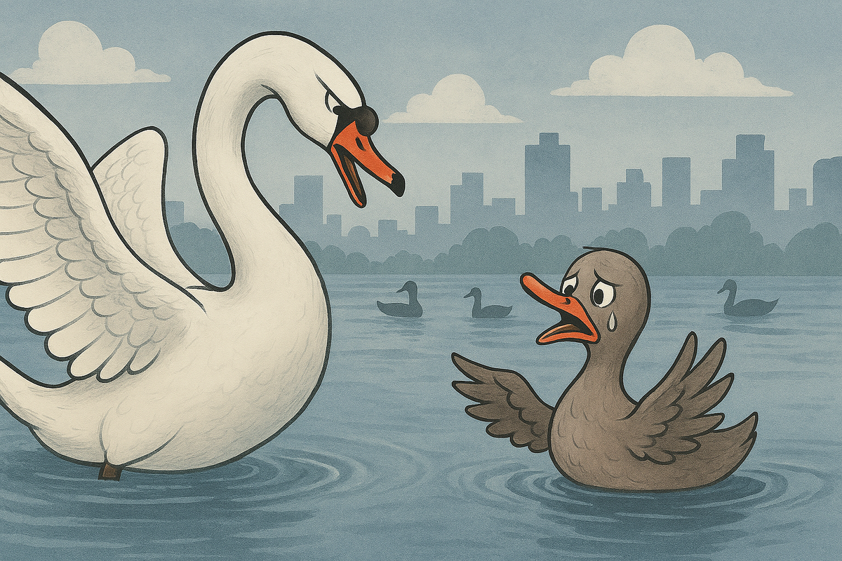 В городском парке, на зеркальной глади пруда, важно держалась стая лебедей. Готовились к перелёту. Один из них, ослепительно-белый атлет, мощно расправлял крылья, играя под солнцем рельефными мышцами. Вытягивал гибкую шею и поправлял перья. Из камышей к нему подплыла серая уточка, маленькая и невзрачная. Она пискнула, глядя на эту величественную подготовку: