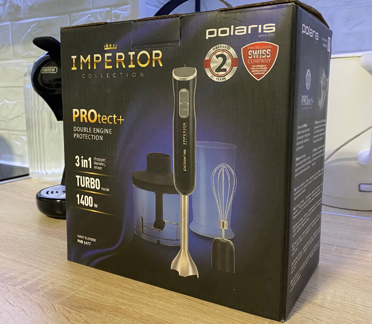 Всем большой привет и добро пожаловать на мой канал! В прошлом своем обзоре я вам рассказывала про очень бюджетную кофемашину с ОЗОН, от которой я осталась в восторге, обязательно заходите на мой канал и почитайте, а сегодня спешу поделится с вами отличным блендером за смешные деньги, который станет вам отличным помощником на кухне - Polaris PHB 1477 Блендер погружной, 1400 Вт. Я искала именно недорогой и функциональный блендер, потому что с наворотами мне ни к чему, а как правила если он идет там 4 в 1, 5 в 1 - это, как правило, дорогие модели. Давайте скорее начнем распаковку, а следом и тест данного помощника. Производитель нам предлагает такой блендер как вариант 3 в 1. В него входит сам блендер погружной с насадкой из нержавеющей стали и двумя кнопками обычного и турбо режимов, венчик для взбивания из нержавеющей стали, чаша измельчителя объемом 0,5 литра и мерный стакан объемом 0,7 литра. Производитель нам утверждает, что данный блендер обладает двойной защитой двигателя (от пер