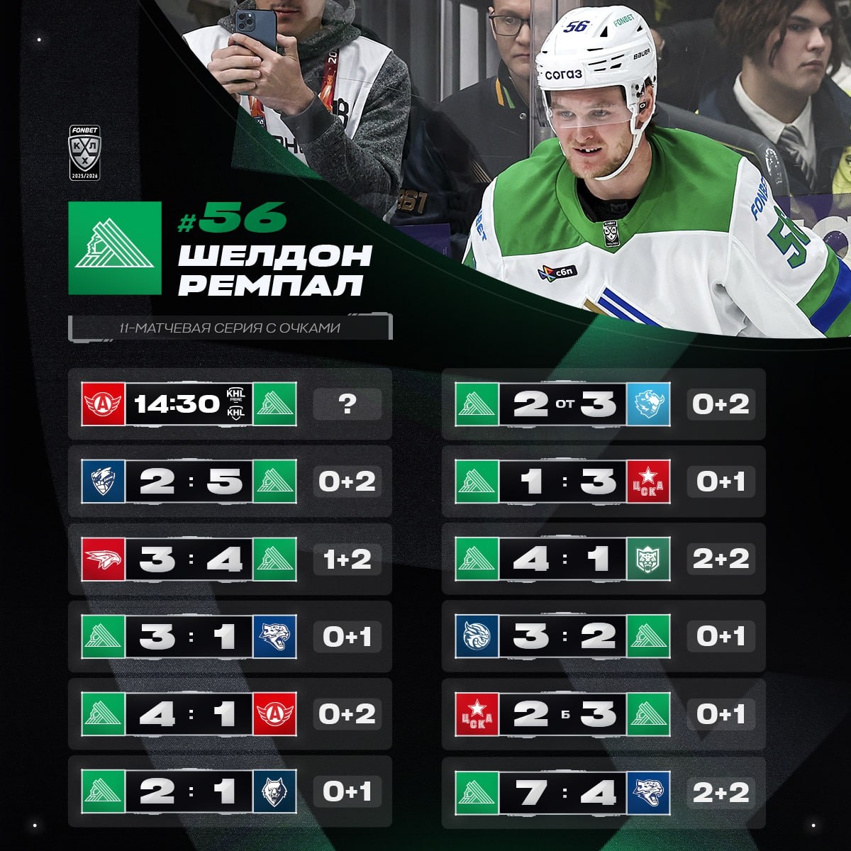 Шелдон Ремпал набирает очки нон-стоп с ноября! Продлит ли канадец свою рекордную результативную серию до 12 матчей сегодня в Екатеринбурге?