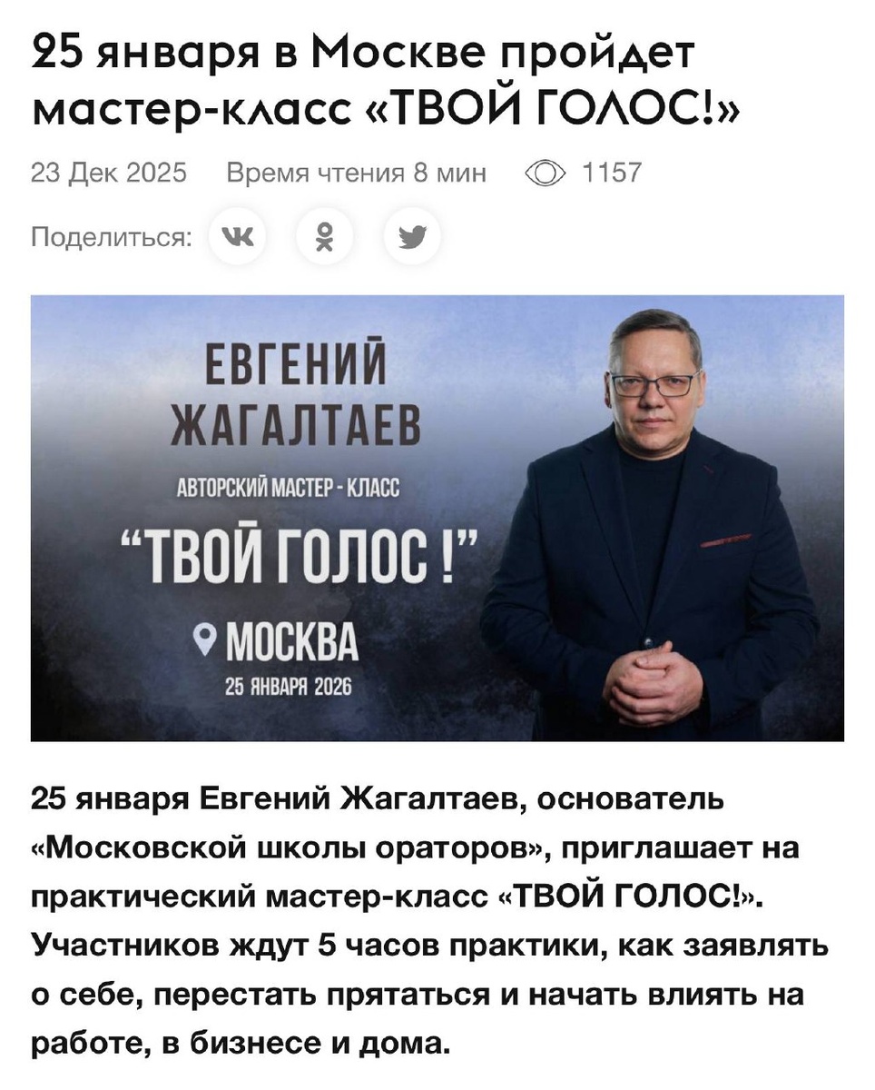 25 января Евгений Жагалтаев, основатель «Московской школы ораторов», приглашает на мастер-класс «ТВОЙ ГОЛОС!». Участников ждут 5 часов практики, как заявлять о себе, перестать прятаться и начать влиять на работе, в бизнесе и дома. В ПРОГРАММЕ — БОНУСНЫЕ ТЕМЫ ОТ ЗВЕЗДНЫХ СПИКЕРОВ: Сергей Коньков Двукратный чемпион КХЛ в составе «Динамо Москва» и выпускник «Московской школы ораторов» Виктория Казанцева Российская актриса кино, озвучания и дубляжа. Профессиональный педагог по технике речи в Театральном институте им. Бориса Щукина Александра Сачкова Медиапродюсер, Selfmade Woman, выпускница Школы Продюсирования Николая Картозии, автор и ведущая проекта «100 оттенков Личного Бренда», медиаментор и организатор бизнес-форумов в Москве ❌Не ждите, когда смелость придет сама. ✅Создайте ее за 5 часов. ❌ Не ждите, когда вас наконец «заметят». ✅Заявите о себе. Осознанно. Уверенно. Твердо. РЕГИСТРИРУЙТЕСЬ И ДО ВСТРЕЧИ! Московская школа ораторов