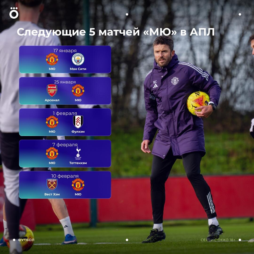 Следующие 5 матчей будут испытанием для Каррика 💀 Сегодня манчестерское дерби, в следующем туре выезд к «Арсеналу», а дальше — «Фулхэм» и «Тоттенхэм» дома. Сколько очков наберут «красные дьяволы» за эти 5 туров? Посчитаем в комментах! 👇 😃 Смотри Okko прямо сейчас!