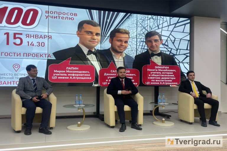 Ученики задавали им непростые вопросы. Взглянуть на работу учителя под совершенно иным углом позволила встреча школьников с представителями педагогического сообщества, которая прошла на базе детского технопарка «Кванториум». Перед началом мероприятия в фойе собирались стайки учеников – представителей разных тверских школ. Юные корреспонденты настраивали видеокамеры, а кто-то уже начал снимать репортаж. 11-классник из школы №49 Егор Нечаев три года возглавляет школьный медиацентр: — Мне интересно погружаться в события и рассказывать о них, — поделился он. — Сегодня пришёл пообщаться с молодыми педагогами. Такие встречи помогают увидеть учителей с другой стороны, задать неожиданные вопросы. У меня приготовлено их несколько . Главные герои встречи обсуждали последние детали своего выступления. Это молодые педагоги центра образования им. А. Атрощанка – учитель информатики Мирон Ларин и учитель истории и обществознания Даниил Сальников, о которых, кстати, портал Tverigrad.ru уже рассказывал