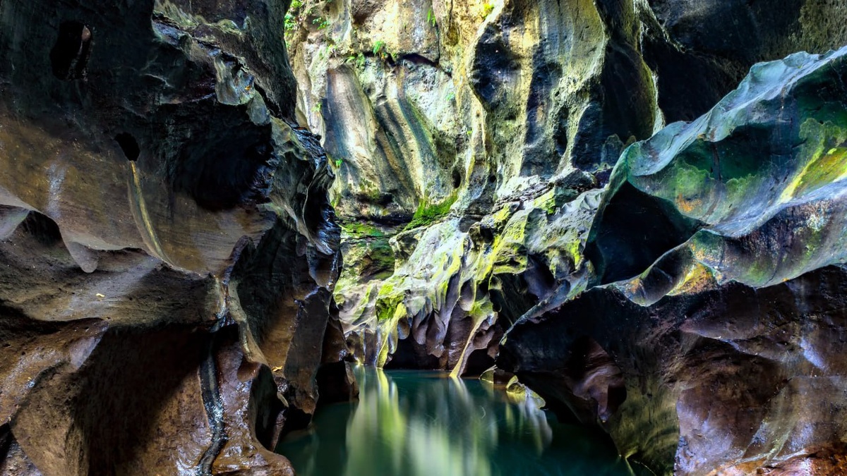 Он расположен на северо-востоке острова Бали недалеко от Денпасара, в деревне Гуванг. Каньон Беджи Гуванг расположен на одноименной реке Беджи (Beji). Он представляет собой ущелье с причудливыми каменистыми формами, выступами, промоинами и отвесными стенами. Скалы каньона в некоторых местах достигают высоты 30 м (примерно как 11-этажный дом). Они покрыты густой тропической растительностью и лианами. В хорошую погоду вода тут изумрудного цвета, а в сезон дождей – совсем непривлекательного мутно-коричневого. Это место образовалось не за один день. Многие тысячелетия река прокладывала себе путь сквозь вулканические горные породы, размывая и подмывая их. В результате и получился каньон с интересными формами и видами. За каждым поворотом здесь спрятан новый уникальный и неповторимый пейзаж. 🤩 Проще говоря. Бали