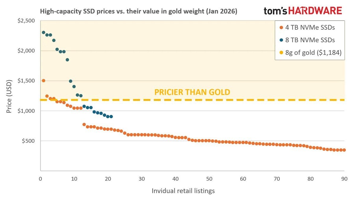 📝 Кратко: Твердотельные накопители большой ёмкости стали дороже золота, если сравнивать цену за грамм, обратил внимание пользователь Reddit. 🔗 Читать оригинальную статью (ссылка) 📊 Источник: Habr ⏰ Время: 17.01.2026 11:08 📱 Другие каналы: 🪙 ВКрипту | 🎮 ВИгрухи | 🏎️ ВТачки | ✈️ ВТравелу #gadgets #гаджеты #технологии