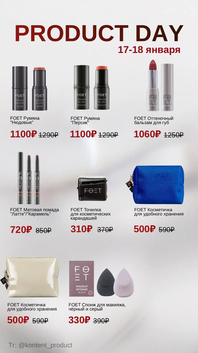 💄✨ FOET — красота со скидками Два дня, чтобы обновить косметичку и собрать полноценный макияж по выгодным ценам 💥 Тон, глаза, брови, губы и аксессуары — всё самое нужное со скидками. В акции: — BB-крем «Идеальная кожа» — Консилеры «Нюд» и «Персик» — Подводки и фломастер-лайнер для глаз — Тени-карандаши (шампань, коричневый) — Карандаши для бровей — Пептидная сыворотка для ресниц и бровей — Румяна (нюд, персик) — Оттеночный бальзам и матовые помады — Спонжи, точилка и стильные косметички ✨ Естественные оттенки ✨ Комфортные текстуры ✨ Макияж на каждый день и для особых случаев Не упусти возможность собрать любимые продукты FOET по приятным ценам — только 17–18 января 💕