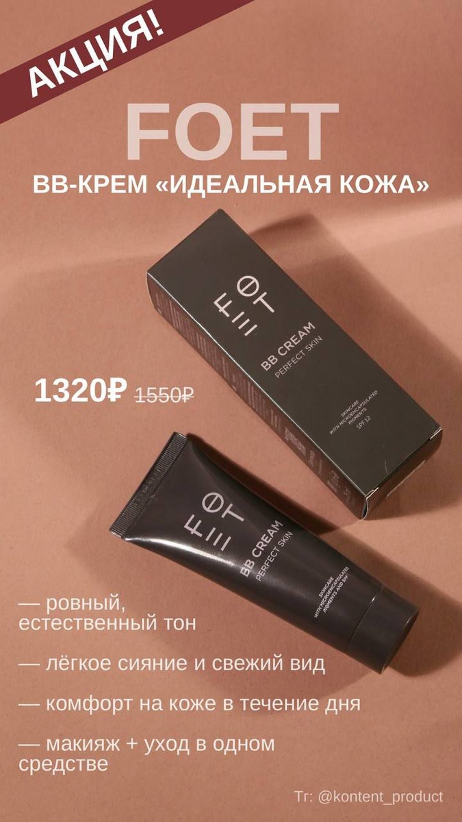 » ✨ 1 320 ₽ вместо 1 550 ₽ Макияж и уход — в одном шаге 💫 BB-крем FOET «Идеальная кожа» создан для тех, кто ценит естественность и комфорт каждый день. Лёгкая, невесомая текстура выравнивает тон, придаёт коже свежесть и натуральное сияние без эффекта маски. А ухаживающая формула, разработанная ведущей итальянской лабораторией специально для FOET, помогает коже выглядеть ухоженной и здоровой. — ровный, естественный тон — лёгкое сияние и свежий вид — комфорт на коже в течение дня — макияж + уход в одном средстве Идеальный вариант для повседневного образа, когда хочется «красиво и без лишних усилий» 💕