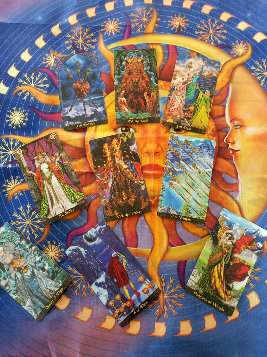 Как только слова сказаны, в ситуацию врывается стремительное движение. Всё, что было заморожено, начинает таять и течь с невероятной скоростью. Карты рисуют образ восьми посланий, летящих по воздуху.