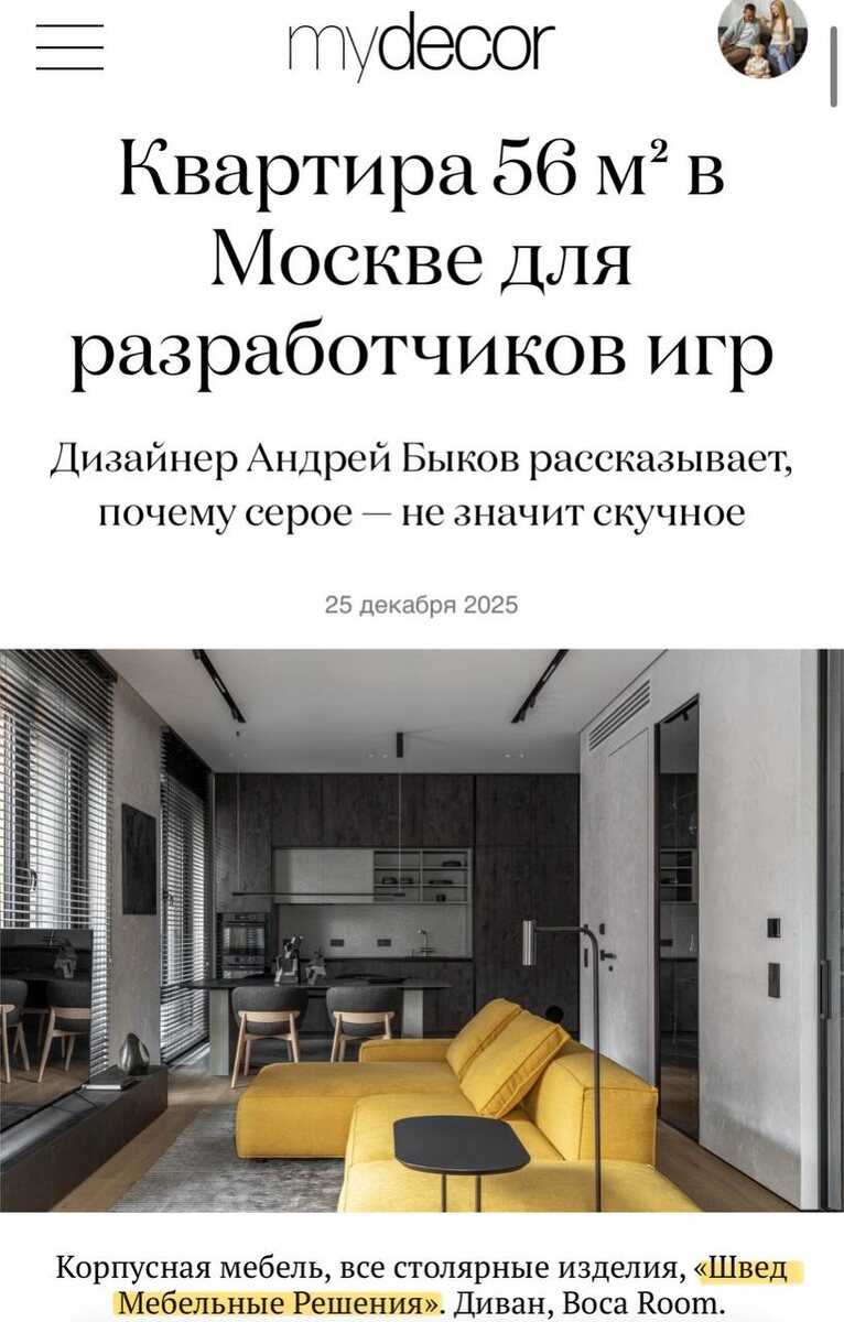 Интерьер создавался для заказчиков, которые живут на Кипре и работают в сфере геймдева. Квартира задумывалась как пространство для приездов в Россию — функциональное, собранное и визуально цельное. По замыслу дизайнера Андрей Быков, двухкомнатную квартиру с изолированной кухней и длинным коридором нужно было преобразовать в открытое современное пространство. Гостиную объединили с кухней, усилив ощущение объема, а приватные зоны сделали компактными и логично организованными. Это второй совместный проект с этими заказчиками, где особенно важной стала работа с планировкой и архитектурой интерьера. Сегодня поделимся с вами фотографиями кухни. Чертежи смотрите в предыдущем посте. #СМИ_ШВЕД