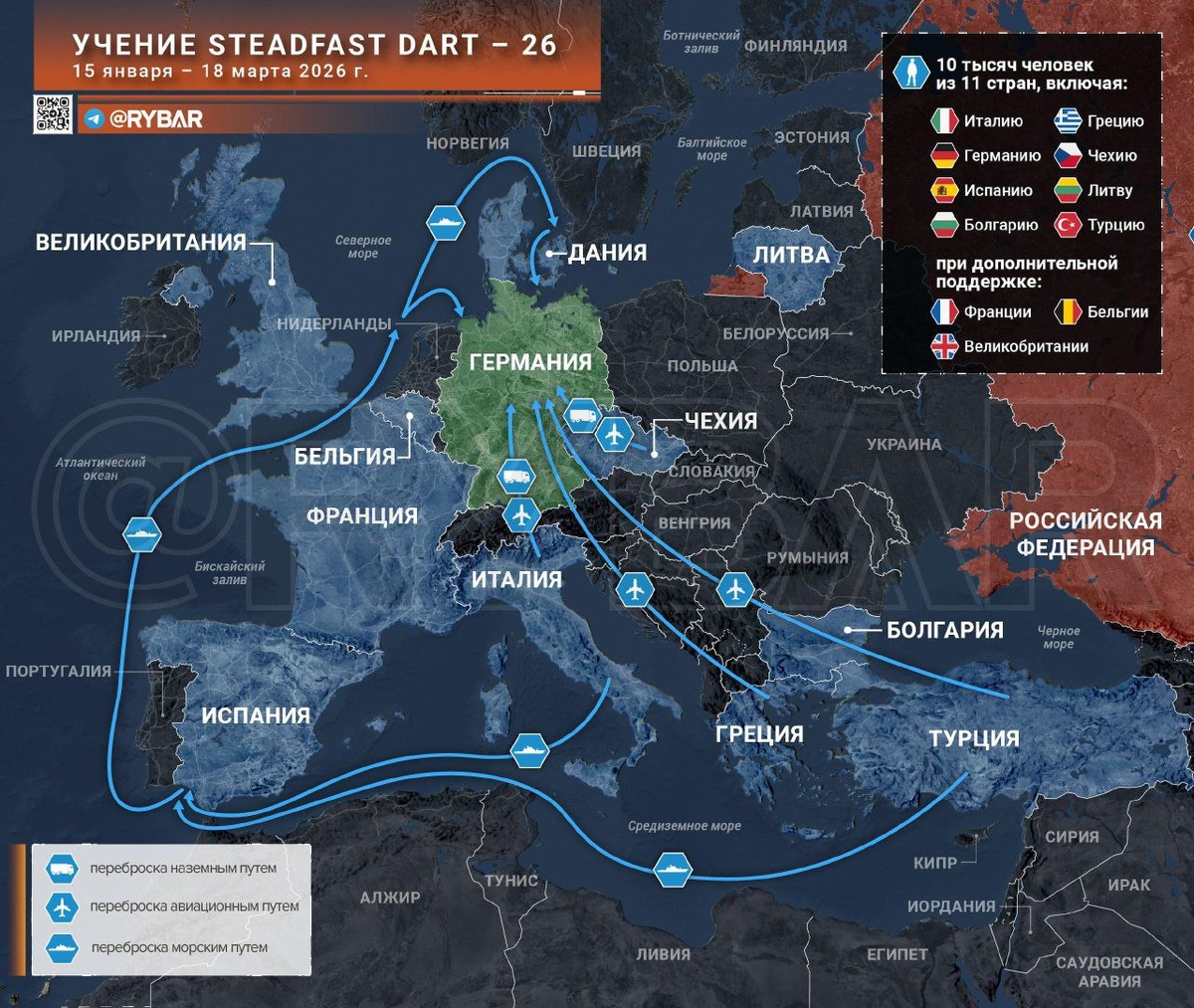 Первое крупное учение НАТО началось – и сразу же в важнейшем Балтийском регионе. С 15 января стартовало мероприятие Steadfast Dart 2026, которое продлится аж до 18 марта. 🔻Что это за учение? 🔸Это крупнейшие маневры по отработке быстрой переброски сил быстрого реагирования (ARF), которые официально были созданы в 2024 году. Их суть в оперативности и возможности развертывания всего через 10 дней. 🔸И Steadfast Dart является ежегодным учением, в котором идет отработка логистических возможностей НАТО. В прошлом году оно проходило в Черноморской зоне, а в этом году центром притяжения станет Германия. 🔸Всего в них поучаствуют свыше 10 тысяч военнослужащих из 11 стран. Транспортировка будет осуществляться по воздуху и море, а также наземным способом. 🖍Акцент НАТО с началом СВО в ходе боевой подготовки заметно сместился. Ранее упор делали на высокоточное оружие, на применение механизированных подразделений, но теперь много времени отдают оперативности и логистике. 🚩Американцы официально в
